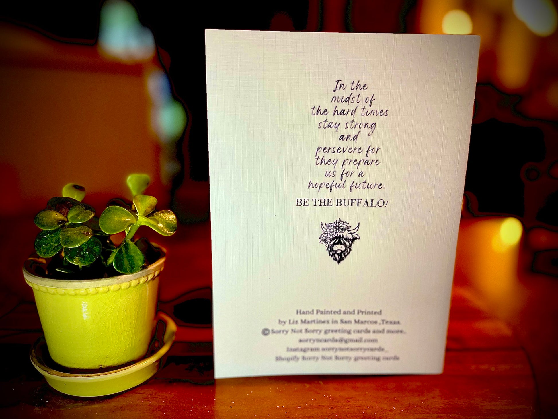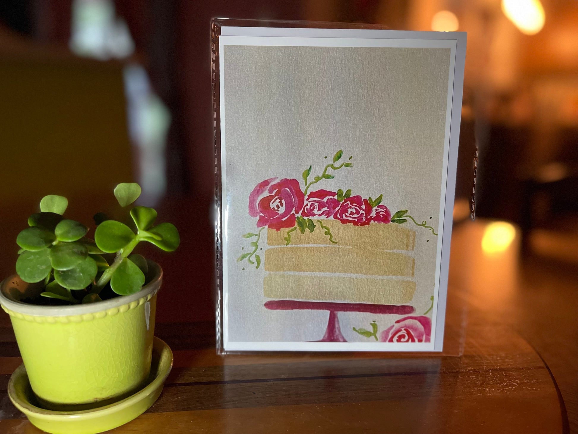 5X7, hand-painted design and printed on linen card stock. Includes envelope and is wrapped in clear plastic.
